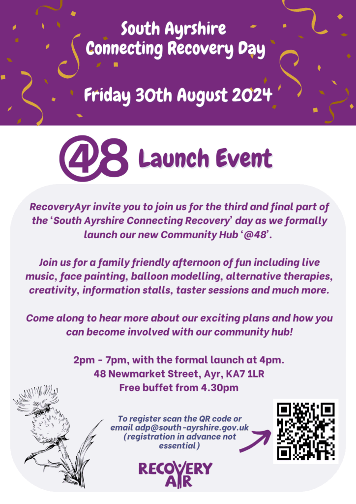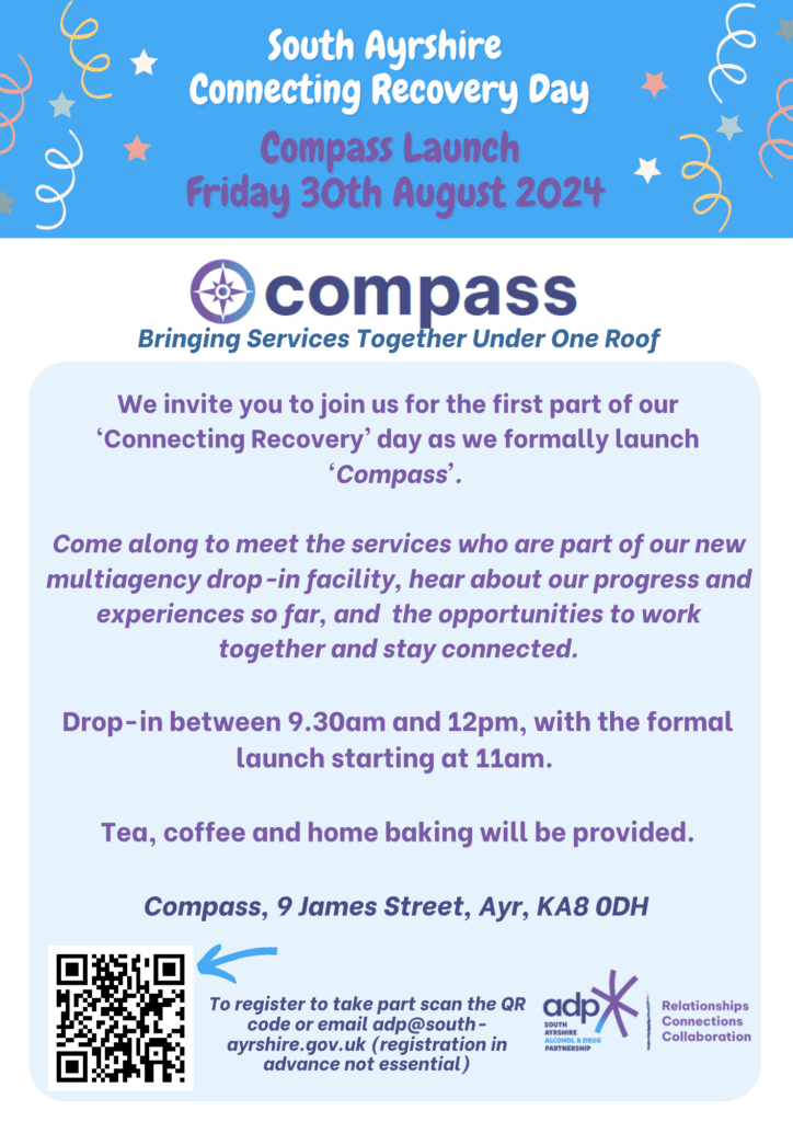 South Ayrshire Connecting Recovery Day 2024 / News / By saadpwebsitdev The three events for our South Ayrshire Connecting Recovery Day are now live with details for each now published: 48 Launch Event Compass Launch Annual Flower Walk Event Flyers
